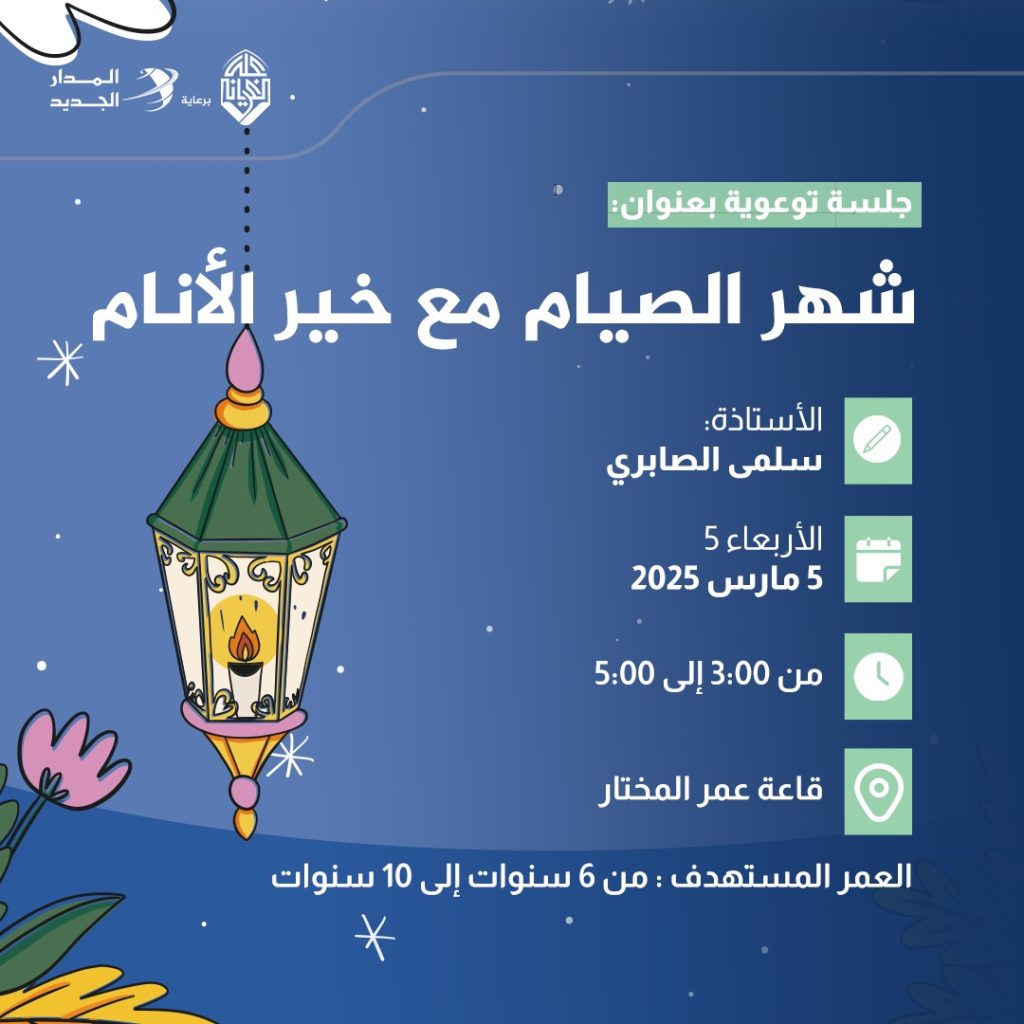 نشاط للأطفال بعنوان: شهر الصيام مع خير الأنام، مع الأستاذة سلمى الصابري. كان النشاط يوم الأربعاء الموافق 5 مارس 2025